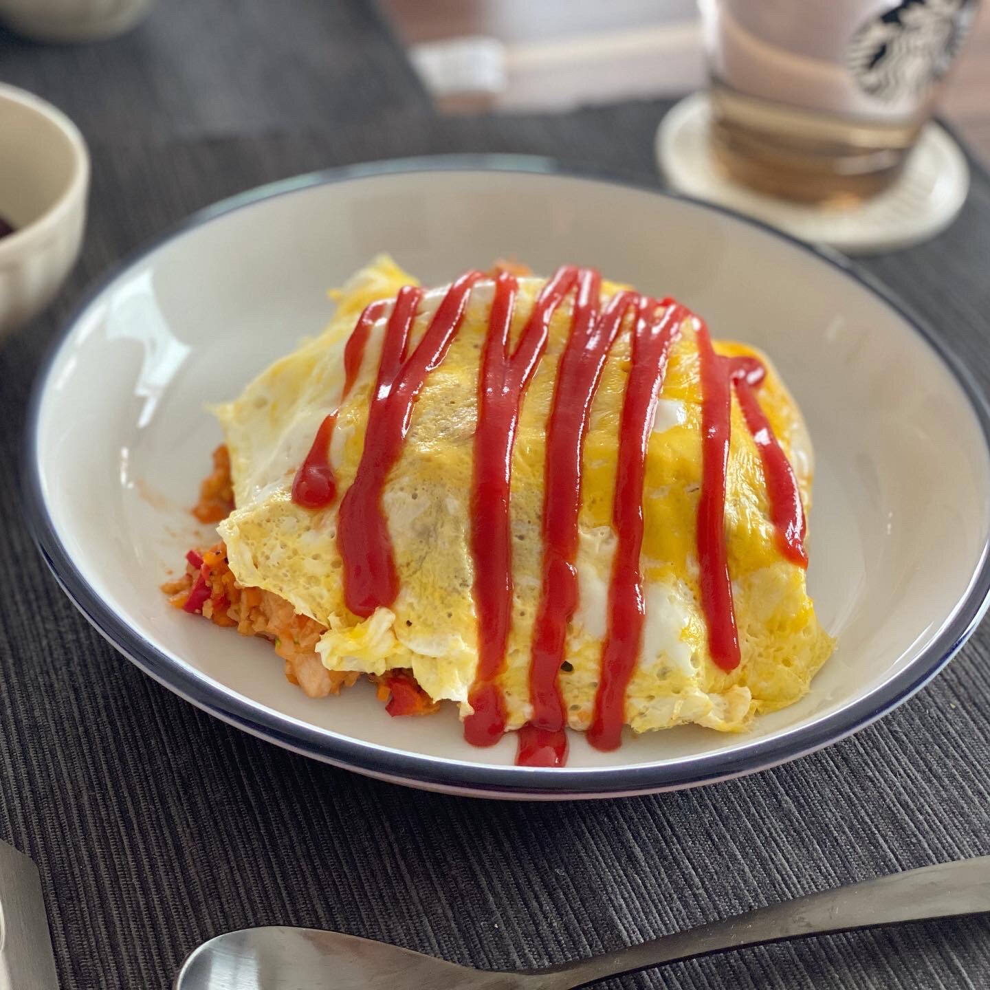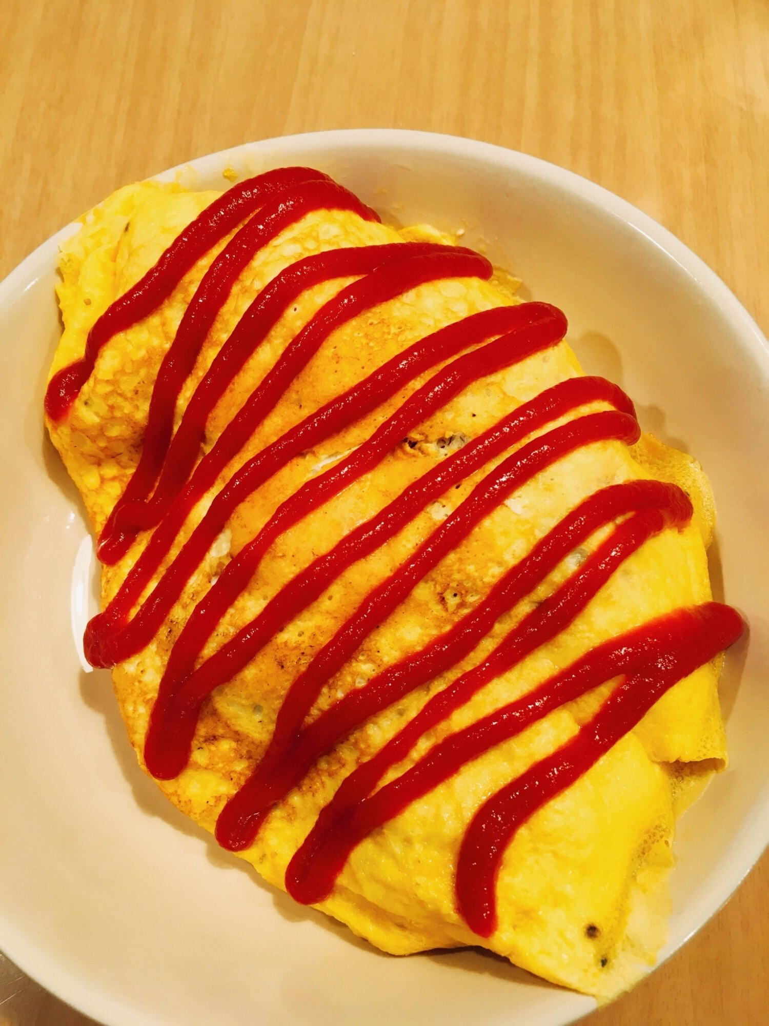 はる 我が母直伝 包まないオムライス 大皿にケチャップライスどーん 薄焼き卵どーん 好きなだけスプーンで取って食べるスタイル 包む手間も失敗もなし ケチャップで名前とかイラストも描きやすいし 量も1人前 自由自在 普段のご飯でも パーティー
